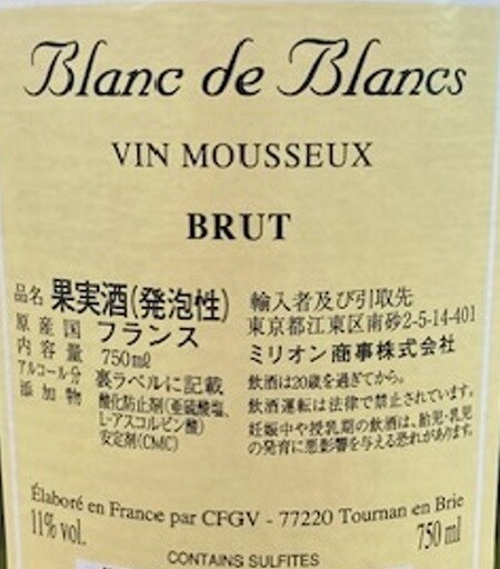 【ブラン・ド・ブラン・ブリュット】ブドウ、ショ糖、出芽酵母、亜硫酸塩、L-アスコルビン酸、安定剤(CMC)
