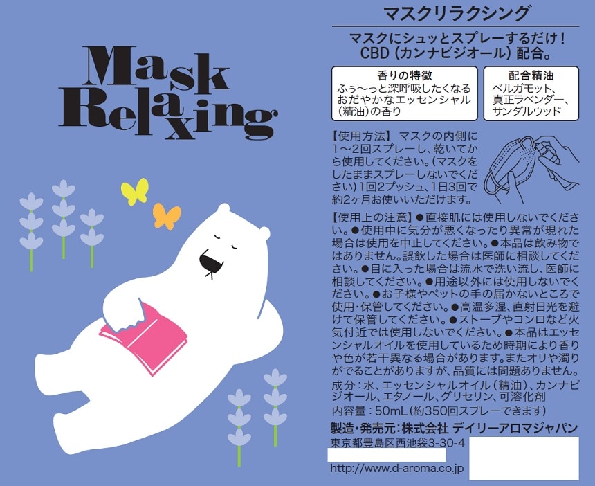 マスクが欠かせない毎日に新提案!マスクの内側にシュッ!とひと吹き。CBD(カンナビジオール)配合。ふぅ~っと深呼吸したくなるおだやかなエッセンシャルオイルの香り。サトウキビ由来のエタノールを使用、自然由来成分94%以上(水を含む)のナチュラル処方。