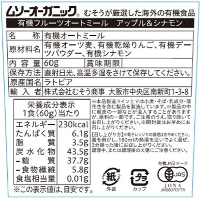 - ・JAS有機フルーツオートミール アップル&シナモン 60g×12個