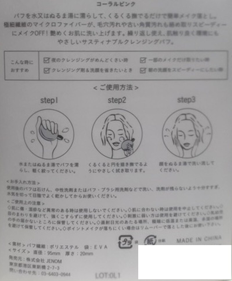 [6個]JENOM PLAN.B MAKE-UP CLEANSING PUFF CORAL PINK 約30g | 「水」だけでメイクOFF&洗顔