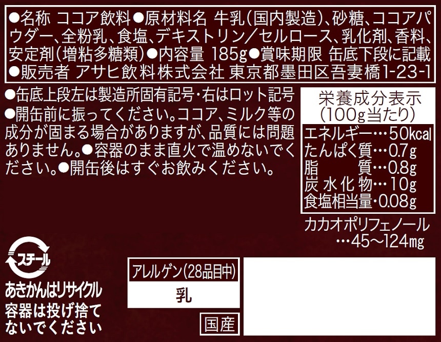[60本]アサヒ飲料 バンホーテンココア 缶 185g | 頑張る自分に労りと自信をくれる濃厚ご褒美ココア