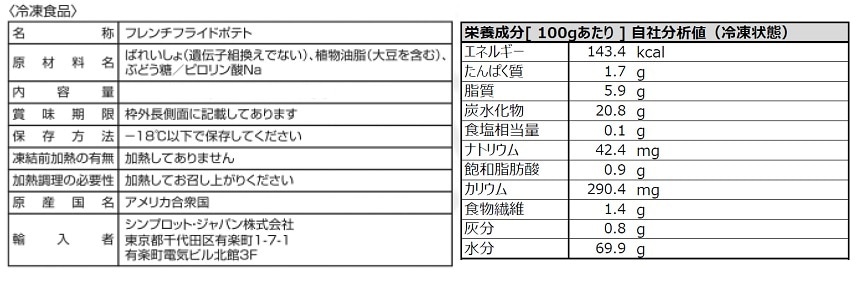 原料は米国産じゃがいもを使用。フライドポテトのザ・定番商品。1/4インチ(6.4mm)角に細目にカットした商品。