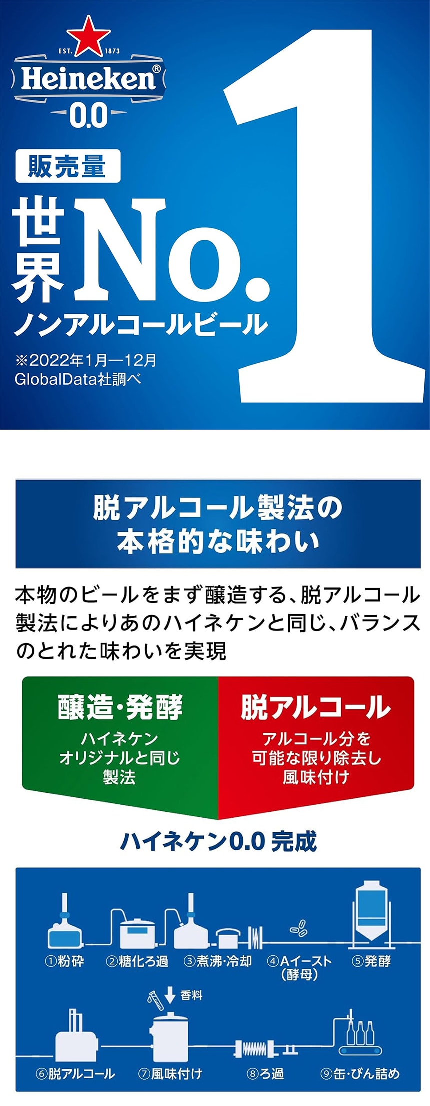 Heineken0.0(ハイネケン ゼロゼロ)は脱アルコール製法で作られており、ハイネケンと同じ製法で醸造されたビールからアルコール成分を取り除き、ハイネケン本来の味わいと高い品質を楽しめるノンアルコールビールテイスト飲料として誕生しました。