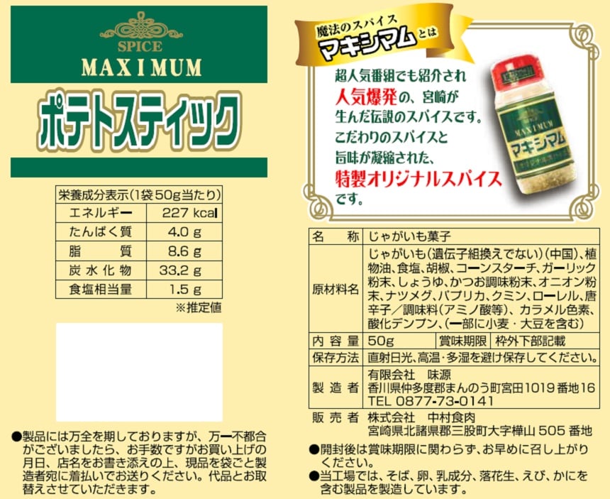 宮崎生まれの魔法のスパイス「マキシマム」を使い、ザクザク食感のポテトスティックを味付けしました。