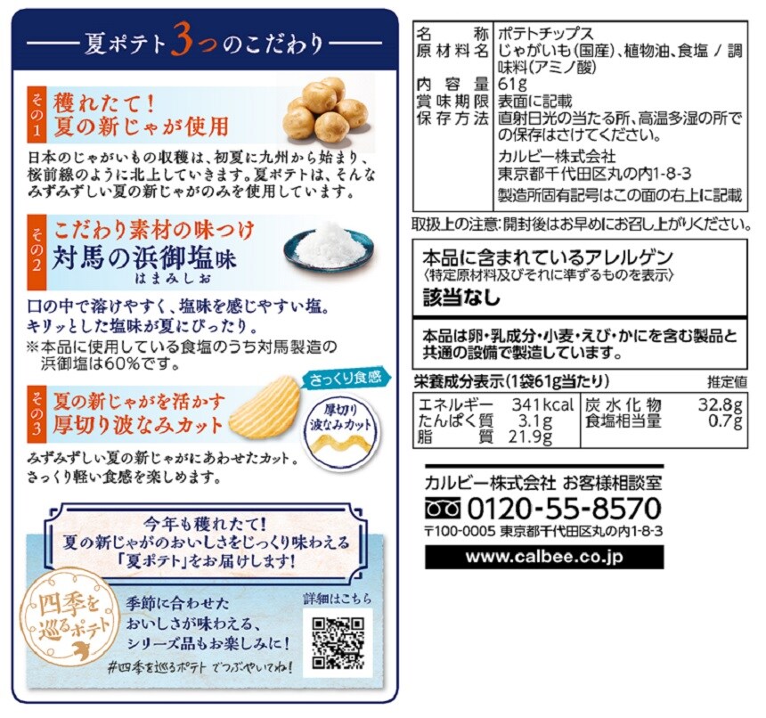 初夏に九州から収穫が始まるみずみずしい夏の新じゃがを使用した、厚切り波なみカットのさっくり軽い食感と、さっぱり軽い味わいが楽しめるポテトチップスです。