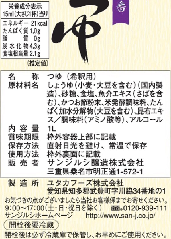 本醸造しょうゆにかつおとこんぶのだしを合わせた、香りと風味豊かな濃縮つゆです。