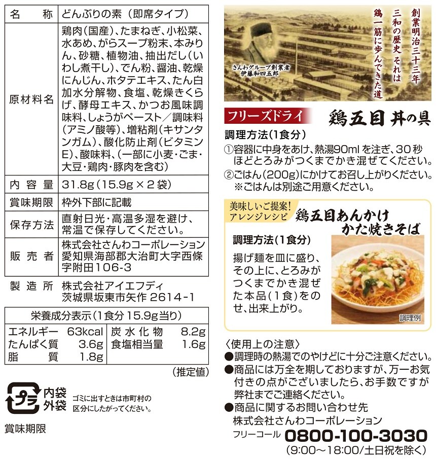 [3種計60食]さんわコーポレーション さんわフリーズドライ3種セット(親子丼の具 / 名古屋コーチンたまご雑炊 / 鶏五目丼の具)