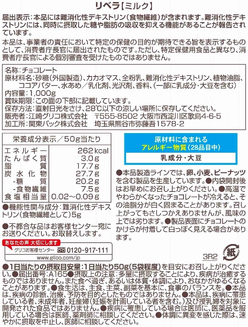 [2箱]【機能性表示食品】江崎グリコ LIBERA<ミルク>大容量品 1000g | 脂肪や糖の吸収を抑える効果がある食物繊維「難消化性デキストリン」を配合した大容量タイプのチョコレート