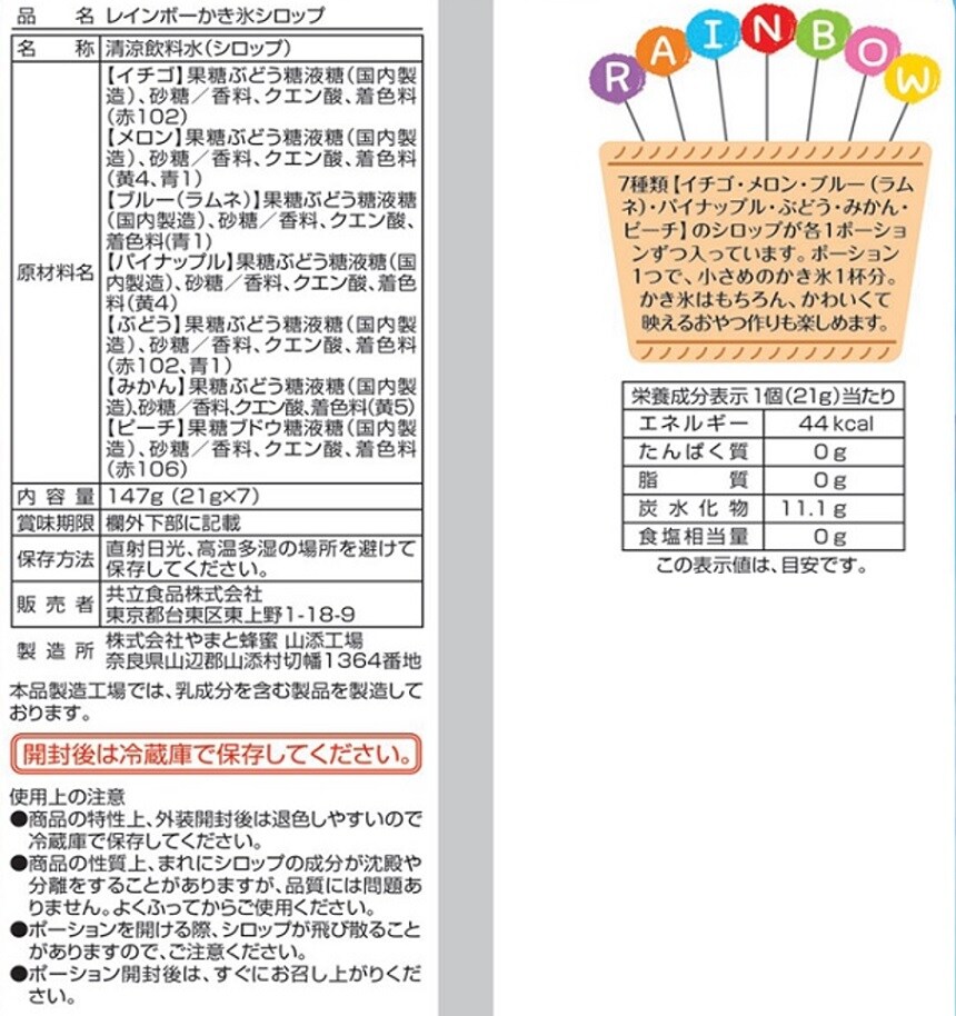 [計168食]共立食品 レインボーかき氷シロップ ポーション 7食入×24袋 | 7種、イチゴ・メロン・ブルー(ラムネ)・パイン・ぶどう・みかん・ピーチをポーションタイプにしてアソートしました