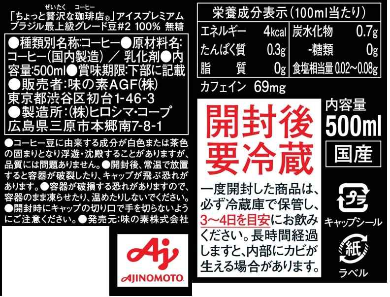 ・「ちょっと贅沢な珈琲店Ⓡ」アイスプレミアム ブラジル最上級グレード豆#2 100% 無糖 500ml×2本 - 賞味期限