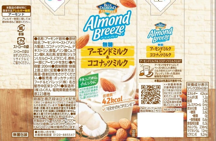 - アーモンド・ブリーズ アーモンドミルク&ココナッツミルク 無糖 200ml