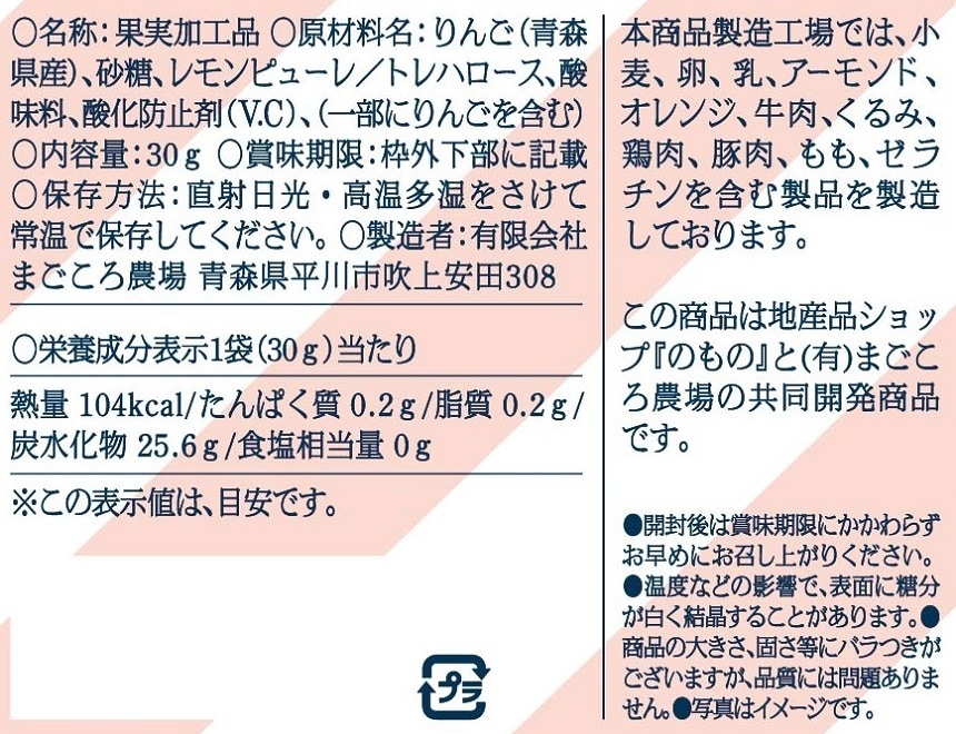 青森県産のりんごを食べやすい半生タイプのドライフルーツに、瀬戸内産レモンの果汁を使った、爽やかな酸味とりんごの甘みが特徴の逸品。