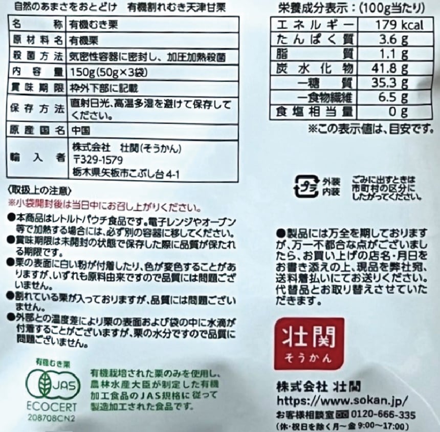 [24個]壮関 有機割れむき天津甘栗 150g(50g×3袋) | 有機天津甘栗を使用した食べやすいむき甘栗です。