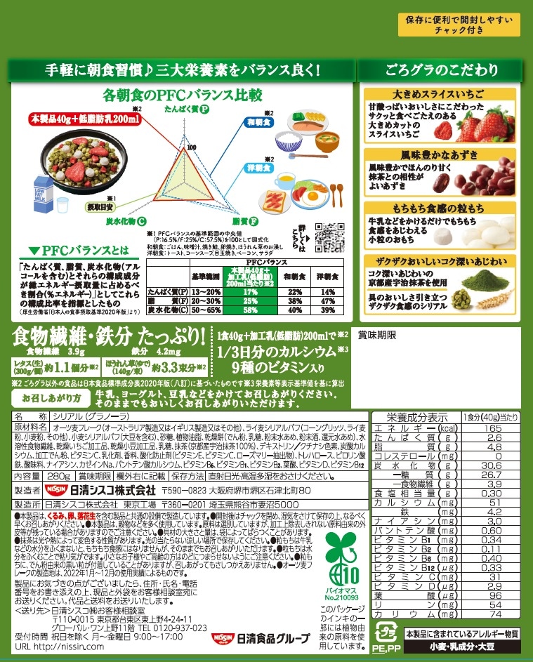 [12袋]日清シスコ ごろグラ 薫る宇治抹茶 280g | 薫りに特徴がある宇治抹茶に、餅の食感、小豆のほのかな甘さ、いちごの酸味で「和」を感じるグラノーラ