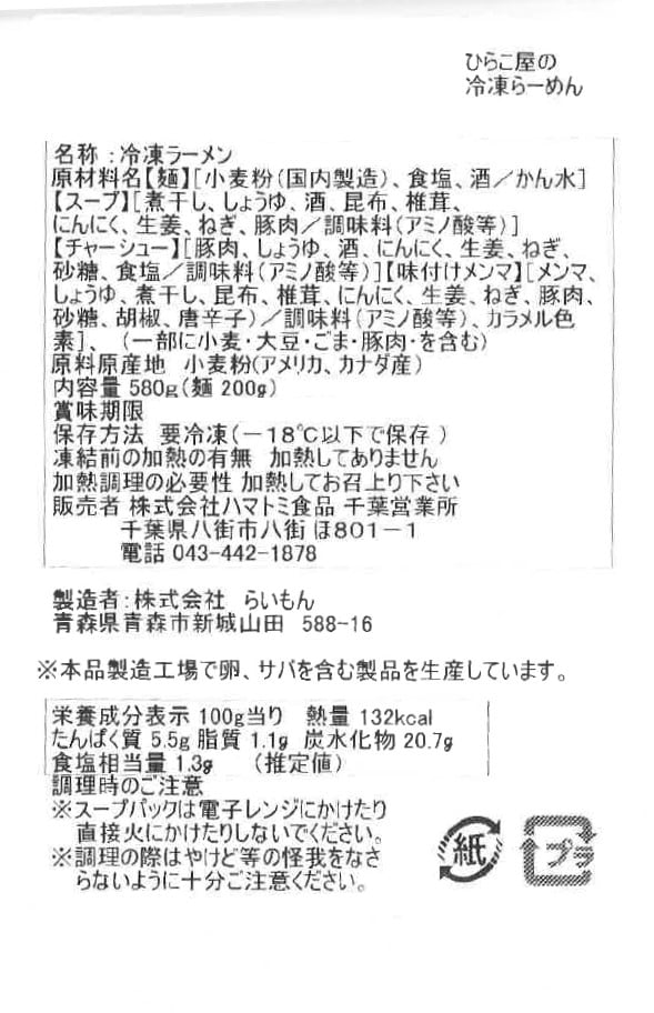 - [冷凍]【3袋】ひらこ屋 煮干しラーメン 580g