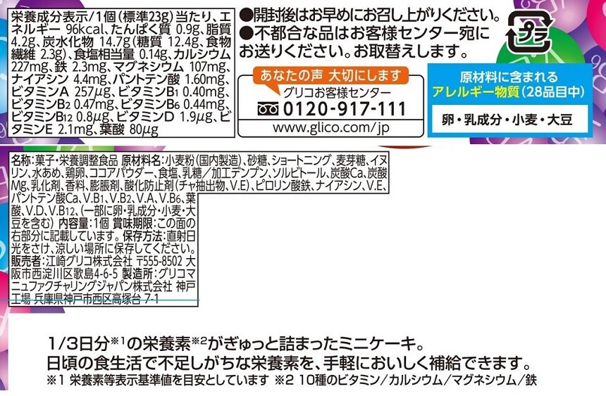 手軽にちょっとした小腹みたしと栄養補給ができる「ちょい食べ栄養食」。コンパクトな食べ切りしっとりミニケーキです。一食で10種のビタミン、カルシウム、マグネシウム、鉄が1/3日分摂れます。