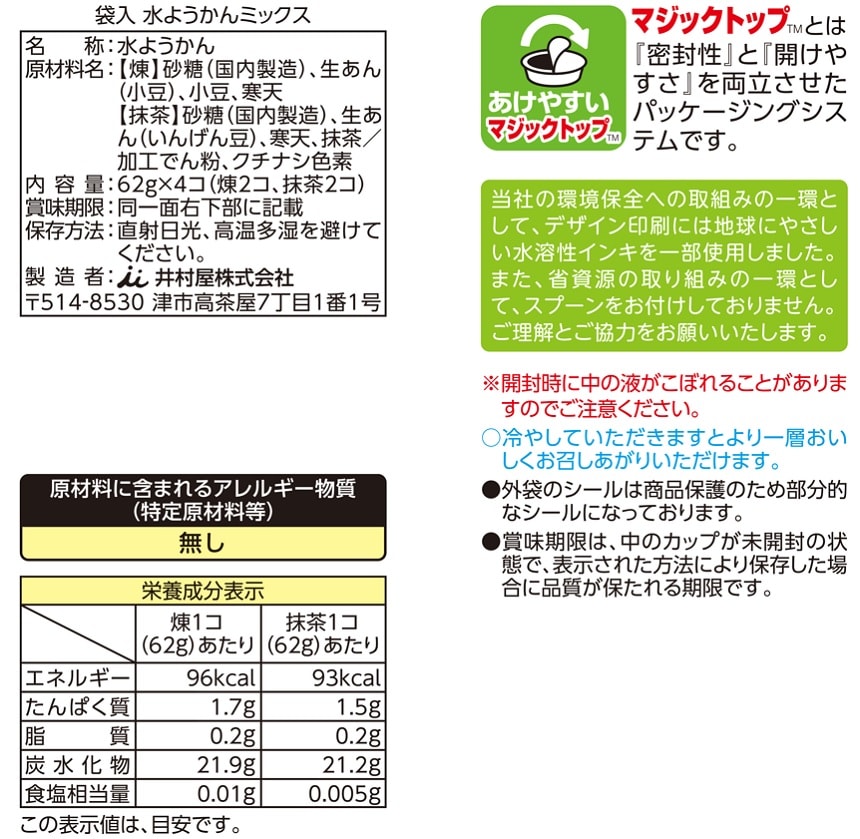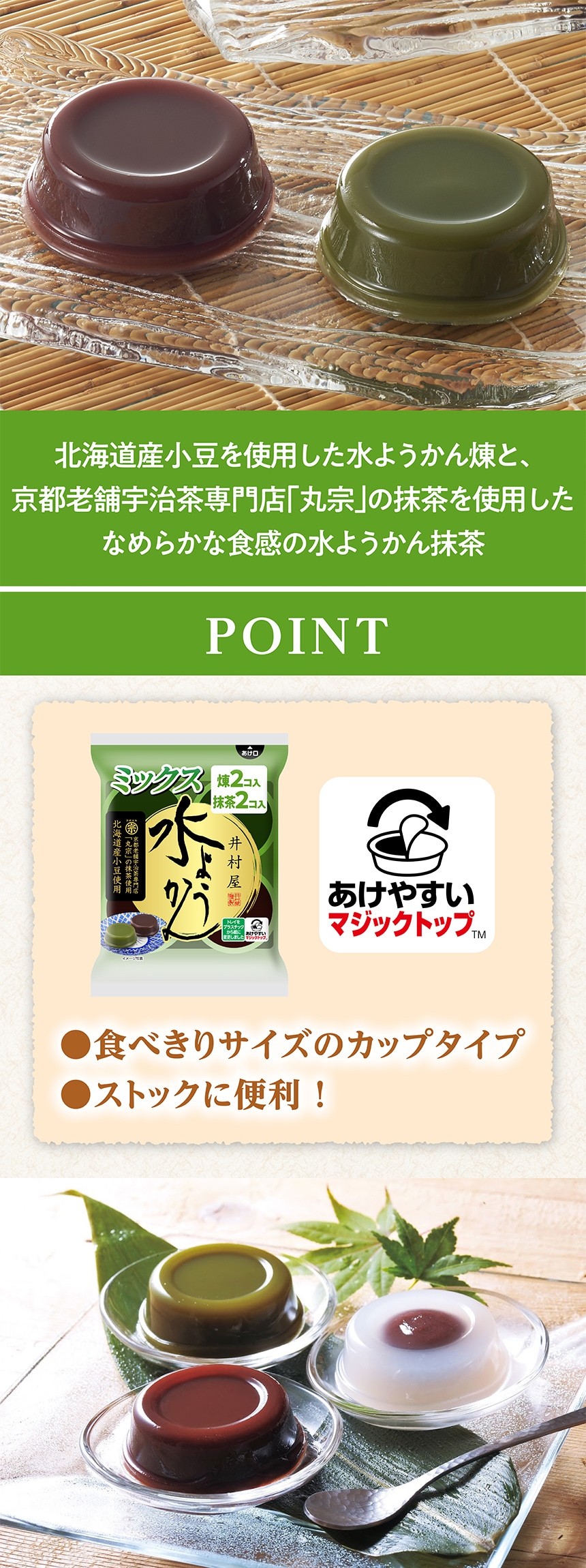 [計80個]井村屋 水ようかんミックス 4個入×20袋 | 北海道産小豆を使用した水ようかん煉と抹茶の風味が豊かな水ようかん抹茶を詰め合わせました。
