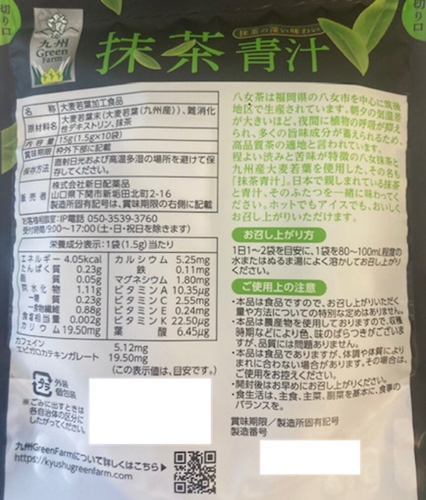 [計100袋]新日配薬品 抹茶青汁 15g(1.5g×10袋)×10個 | 福岡県産の八女抹茶と九州産の大麦若葉を使用した、抹茶の深い味わいを感じられる青汁です。