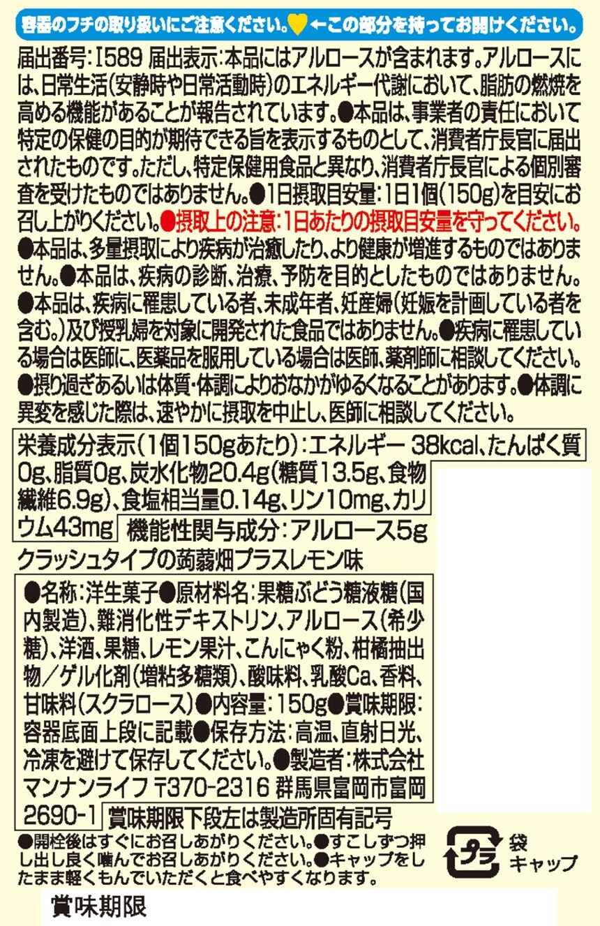 [30個]【機能性表示食品】マンナンライフ クラッシュタイプの蒟蒻畑プラス レモン味 150g | 脂肪の燃焼を高める