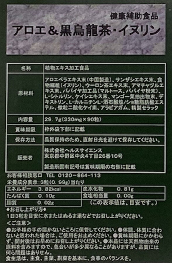 [2個] ヘルスサイエンス アロエ&黒烏龍茶・イヌリン 90粒入 | 毎日の生活習慣や食生活が気になる方へ 黒ウーロン茶ポリフェノール配合