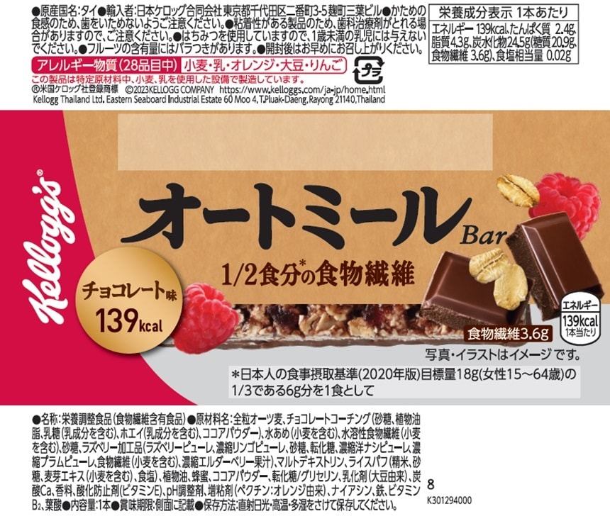 ベースには100%オートミールを使用しており、ミルクチョコレートコーチングをたっぷり施し、ラズベリーの香りが楽しめ、しっとり食感が特徴です。