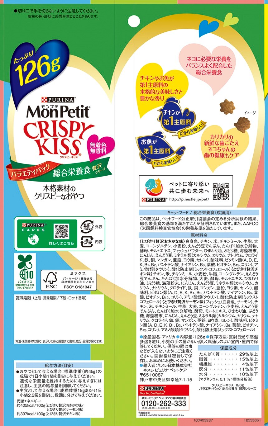 [2個]ネスレピュリナペットケア モンプチ クリスピーキッス バラエティパック 総合栄養食 贅沢シリーズ 126g | 手からあげるしあわせ♪