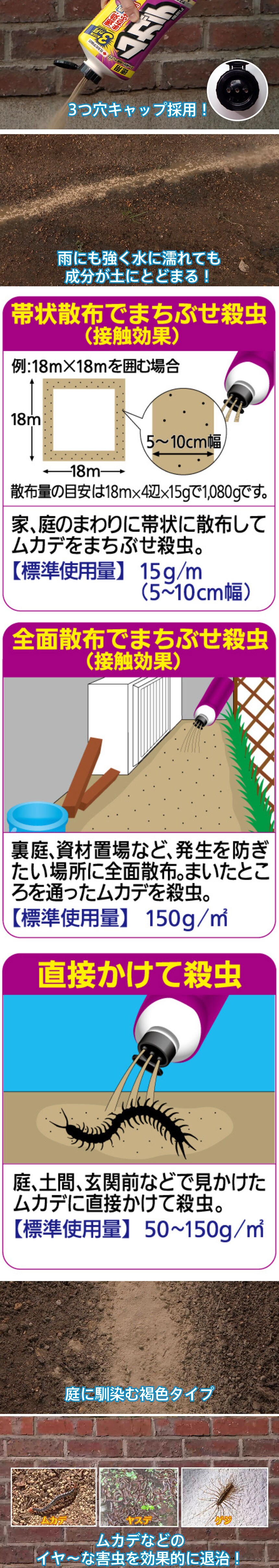 ・こまかい粉がムカデ、ヤスデ、ゲジなどイヤな虫にまとわりついてしっかり速効退治