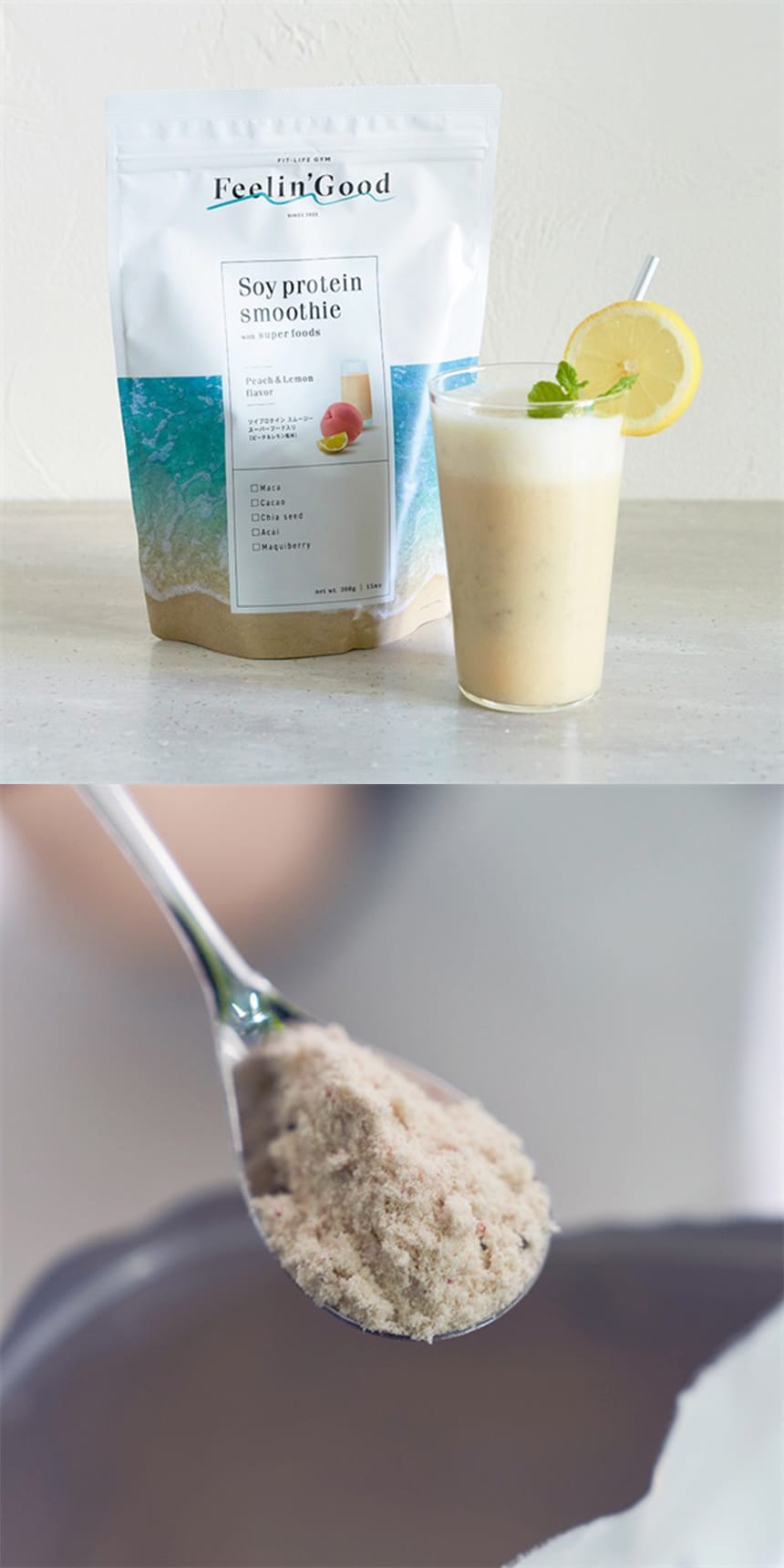 本品は、植物たんぱく質でカラダの内側からキレイをサポートするプロテインスムージーです。燃焼サポートのL-カルニチンをや、一緒に摂取しているビタミンやアミノ酸などの吸収をサポートする黒胡椒抽出物を配合。5種類のスーパーフード(マカ、カカオ、チアシード、アサイー、マキベリー)を配合しました。ピーチ&レモン風味で無理なく続けられます。