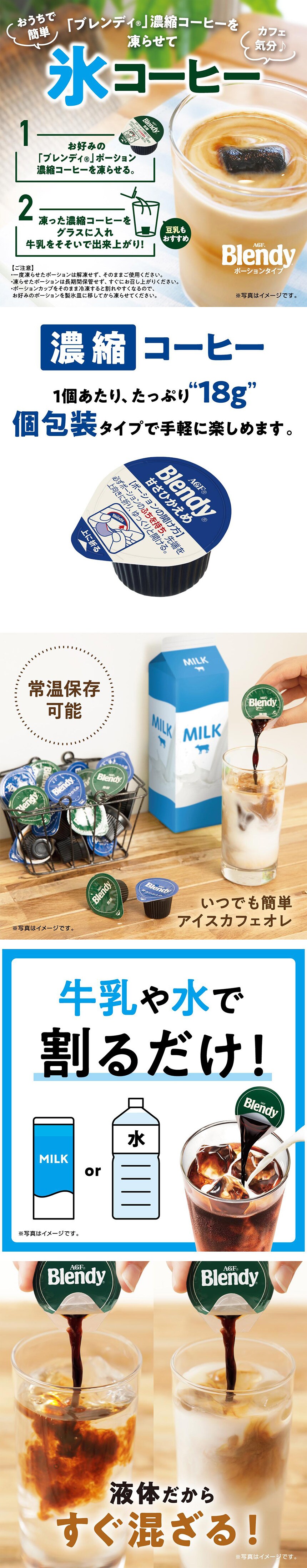 「Blendy(ブレンディ)」 ポーションは、冷たい牛乳(ミルク)や水をそそぐだけで簡単に、コクのあるアイスコーヒーやカフェオレが楽しめる濃縮タイプの希釈用ドリンク ポーションです。