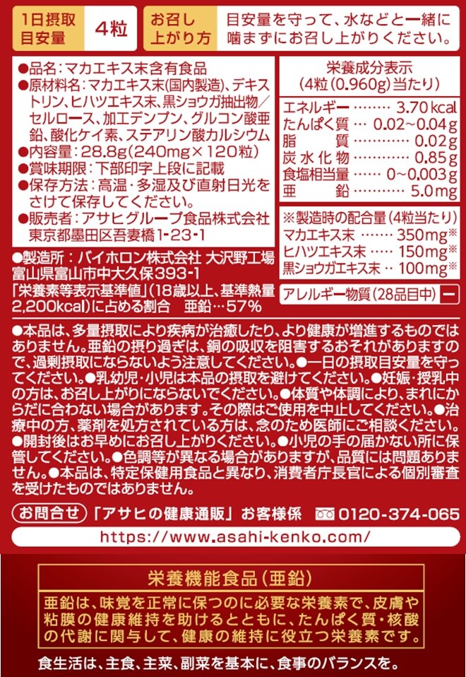 [計120日分]アサヒグループ食品 アサヒ「マカ」120粒パウチ 30日分×4個 | 活力あふれる毎日を過ごしたい方に