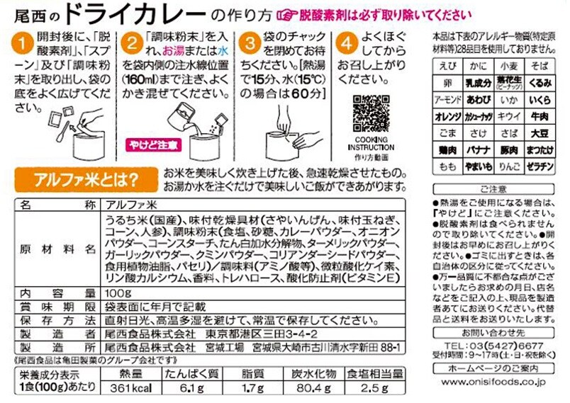 「尾西のアルファ米ドライカレー(アレルギー対応品)は4種の野菜とスパイスのさわやかな香り。アレルギー物質(特定原材料等)28品目不使用。スプーン付きで、何処でもお召し上がりいただけます。でき上がりの量は、お茶碗大盛り1杯分、260g!。お湯で約15分、水で約60分でふんわりご飯ができあがり。