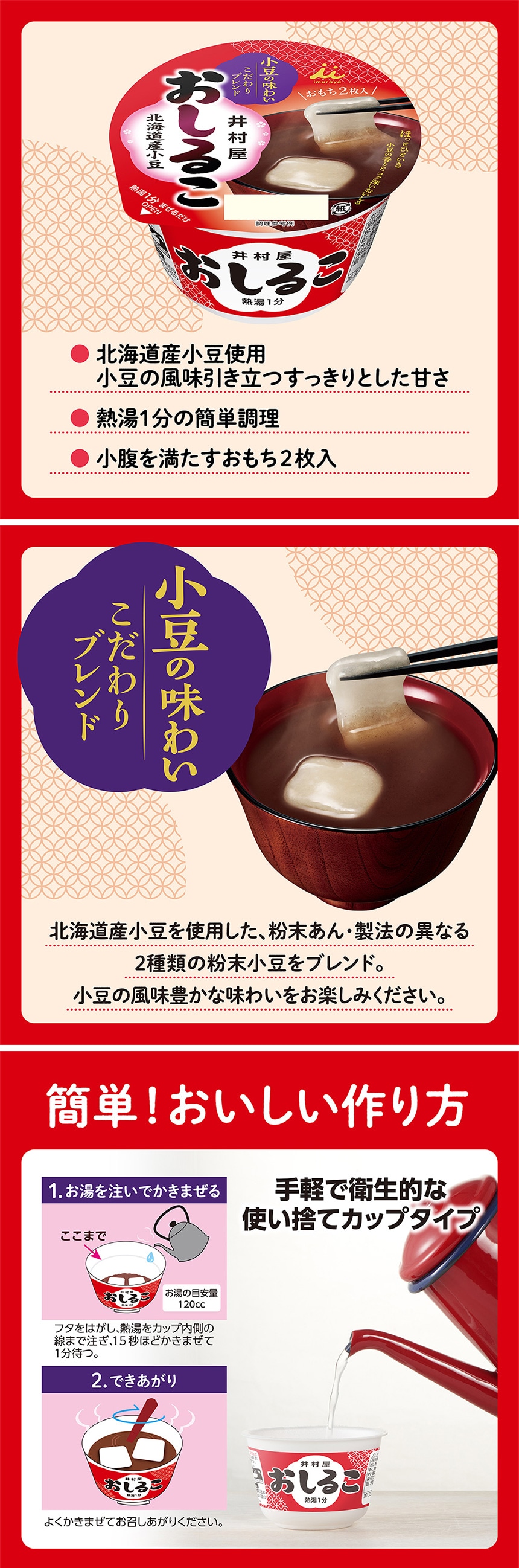 北海道産小豆を使用。お湯をかけるだけで食べられる便利なカップ付きのもち入りおしるこです。