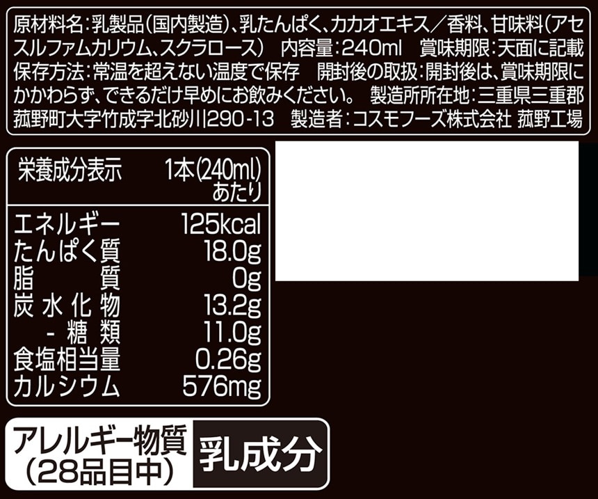 高吸収タンパク質18g、脂肪0・砂糖不使用。