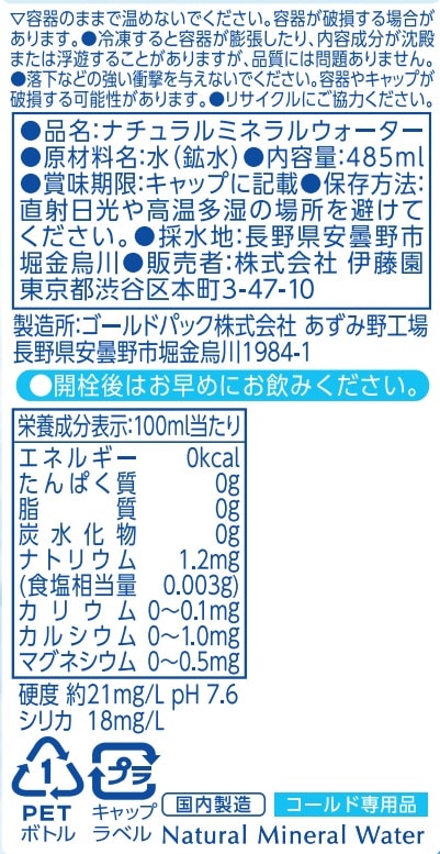 [48本]伊藤園 天然水(冷凍兼用ボトル) PET 485ml | 冷やしても常温でも冷凍でもおいしい安曇野が育んだ天然水