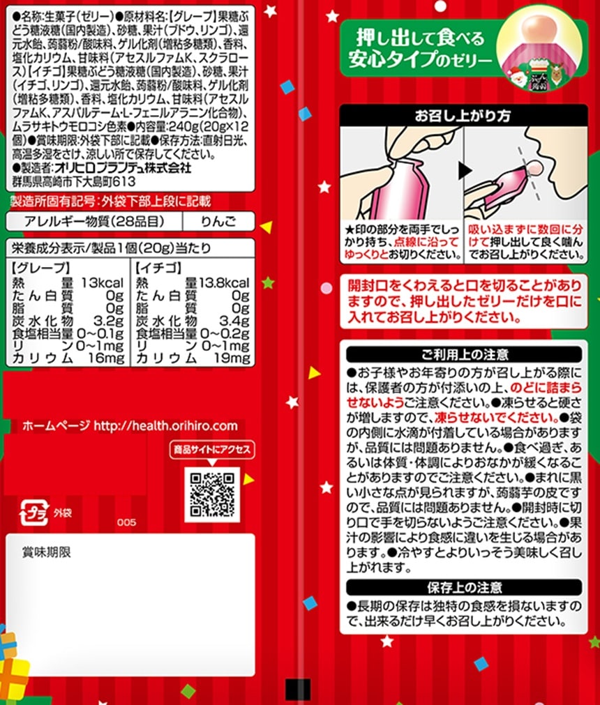 本品は、果汁感たっぷりの美味しく手軽なプチサイズの蒟蒻ゼリーで、クリスマスパッケージのオリジナル仕様品です。