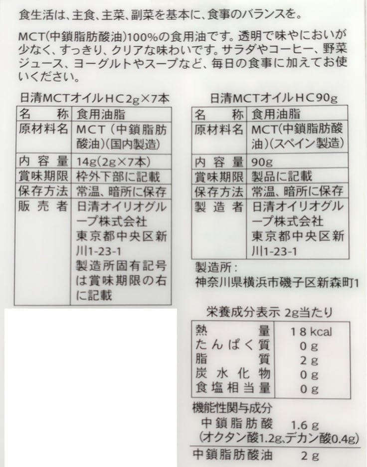 MCT(中鎖脂肪酸油)100%の食用油です。BMIが高めの方の体脂肪や内臓脂肪、 ウエストサイズを減らす機能性です。 無味無臭なので、いつもの料理や飲み物の味 そのままでお使いいただけます。