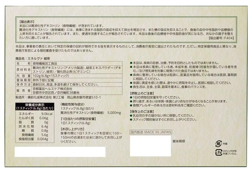 [75包]【機能性表示食品】京都薬品ヘルスケア ミネルヴァ 緑茶 15包×5個 | 食後の"血糖値"”中性脂肪”の上昇を抑える&”便通を改善する”