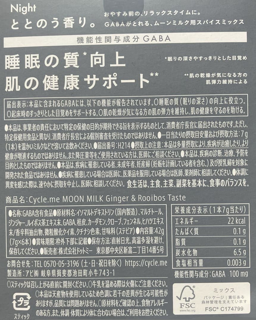 [計72本]【機能性表示食品】ドットミー ムーンミルク ジンジャー&ルイボス 42g(6本入)×12個 | 「機能性表示食品」睡眠の質の向上に役立つGABA入りミルク用スパイスミックス