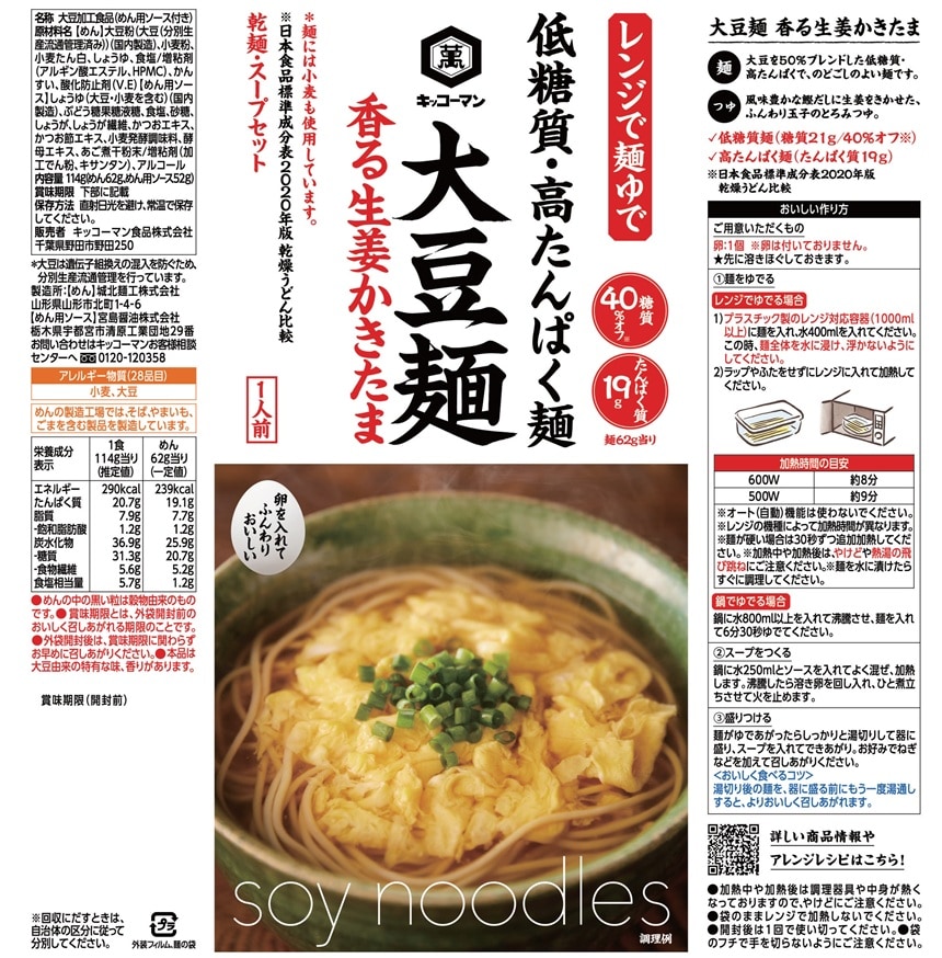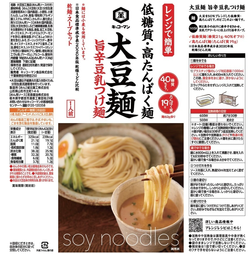 大豆を50%ブレンドした低糖質・高たんぱくでのどごしのよい麺に、満足感のある1食に仕上がるスープをセットにしました。