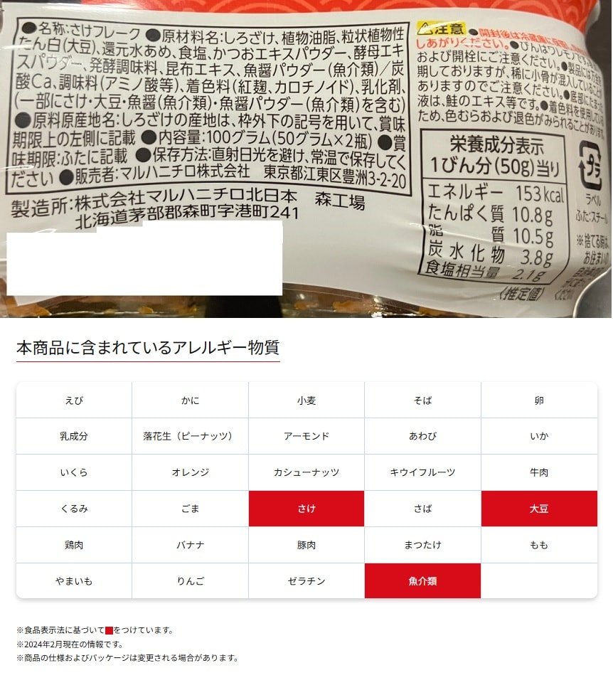 白鮭を原料とし、ふっくら食感が特徴のさけフレークです。大豆たん白入りです。