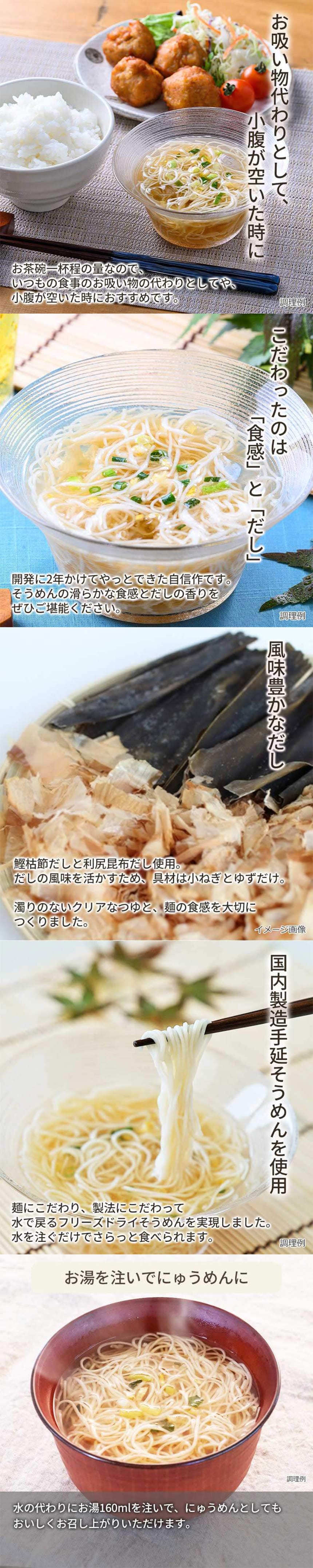 麺にこだわり、製法にこだわって水で戻るフリーズドライそうめんを実現しました。