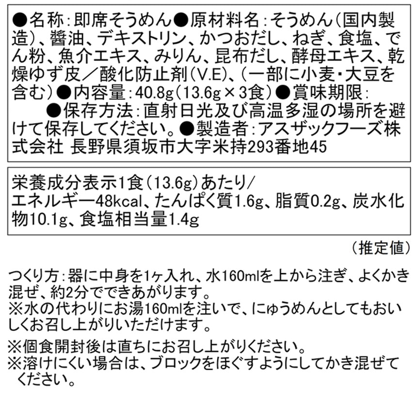 [計48食]アスザックフーズ 柚子香る水戻しそうめん 40.8g(13.6g×3食入)×16袋 | 水を注いでそうめんに、お湯を注いでにゅうめんになる、フリーズドライそうめんです。