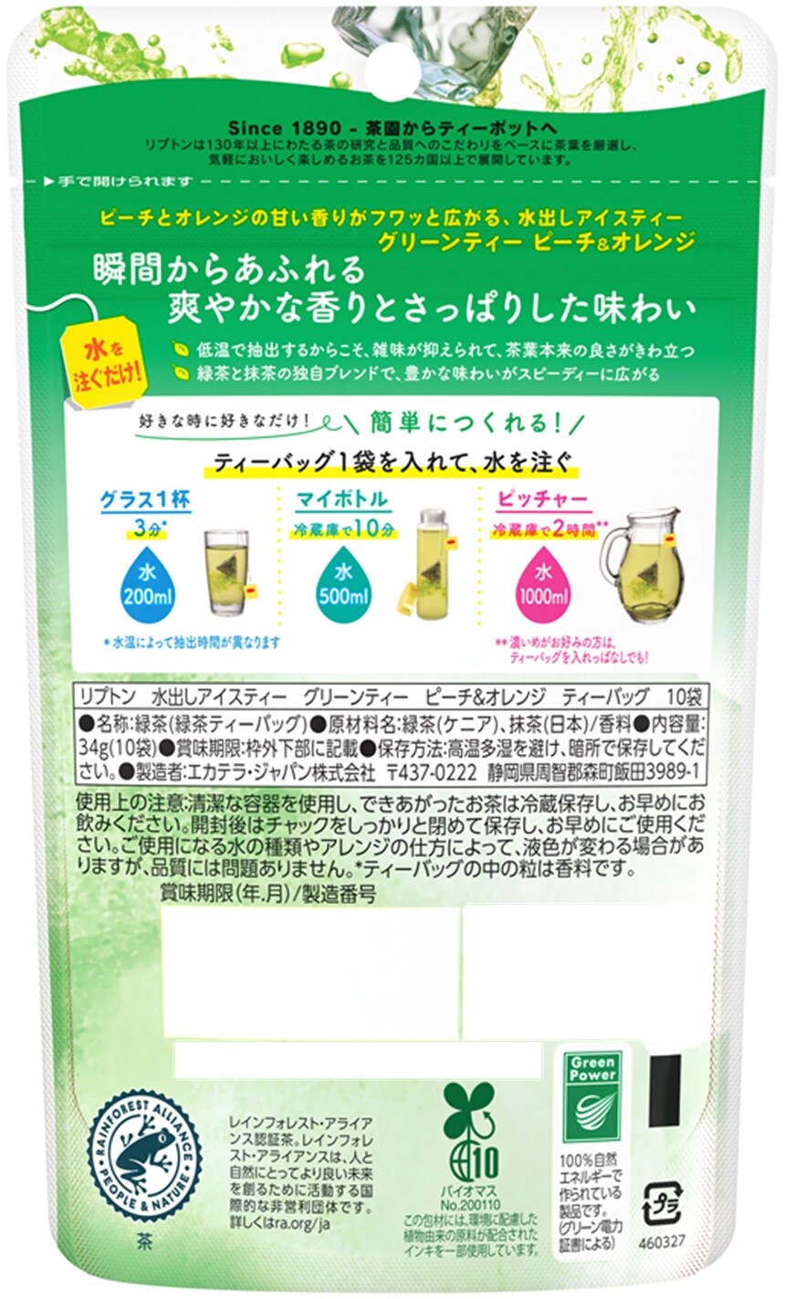 - リプトン 水出しアイスティー グリーンティー ピーチ&オレンジ ティーバッグ 10袋入