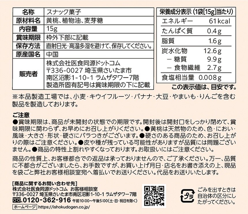 [96袋]医食同源ドットコム 黄桃スナック プレーン味 15g | 小腹が空いたときのおやつにピッタリ!