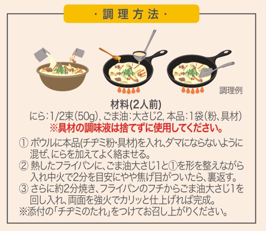 3種類の具材と粉、特製のたれをセットにし、チヂミ粉と具材を混ぜて焼くだけで簡単に韓国本場のチヂミが楽しめる商品です。