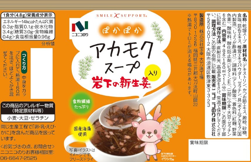 [120個]ニコニコのり アカモクスープ 岩下の新生姜入り 4.8g | 「岩下の新生姜Ⓡ」を使用した、さわやかな辛味が特徴のアカモクスープ