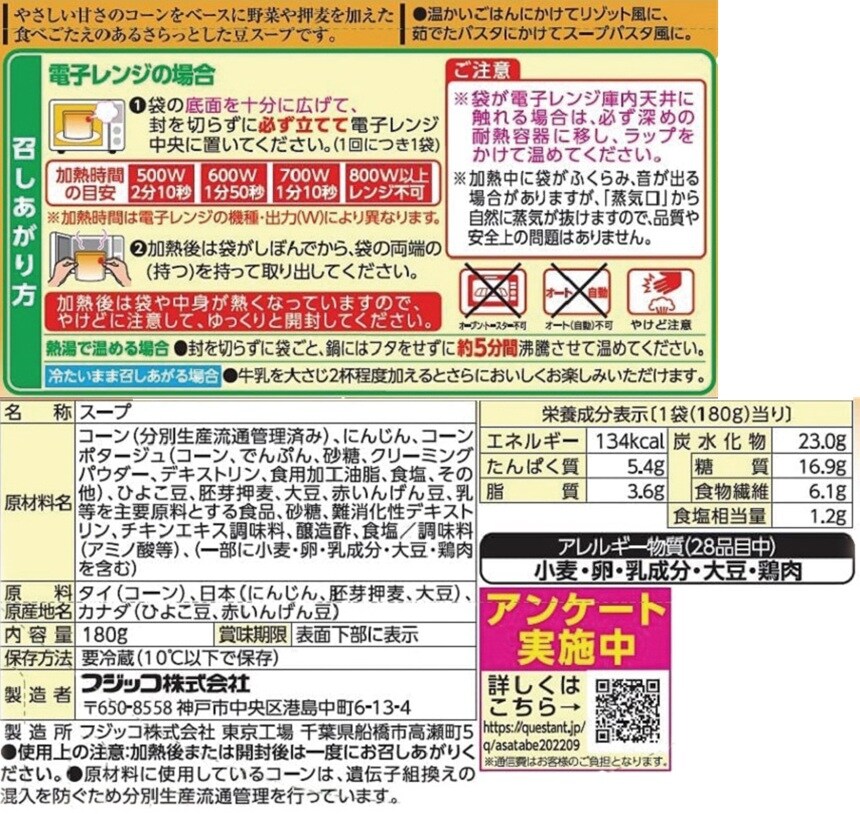 - [冷蔵]フジッコ 朝のたべるスープ コーンチャウダー 180g×5個