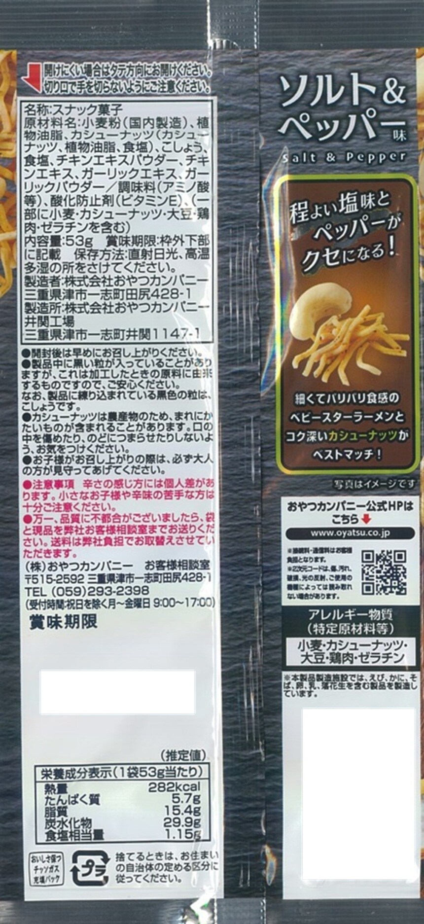 白胡椒と黒胡椒の2つの胡椒がきいた細くてパリパリ食感のベビースターラーメンと、コク深いカシューナッツを合わせました。
