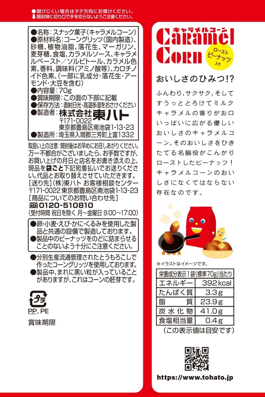 香ばしい皮つきのローストピーナッツが、キャラメルコーンをよりおいしく引き立てます。