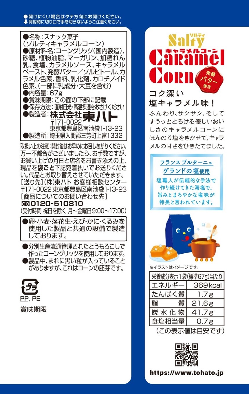 [24袋]東ハト ソルティキャラメルコーン 67g | ふんわり、サクサク、そして口の中ですうっととろける優しいおいしさのキャラメルコーンに、ほんのり塩をきかせてキャラメルの甘さをひきたてました。